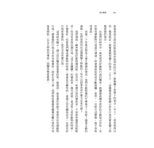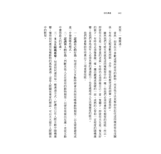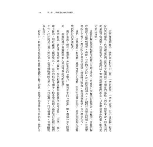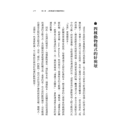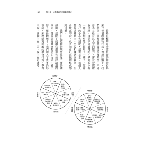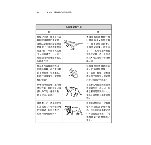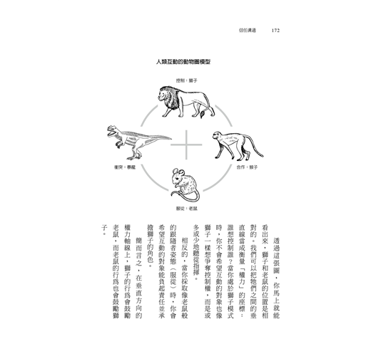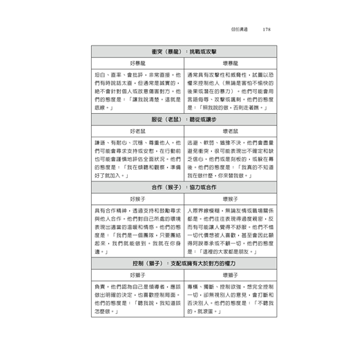稍後,我們會詳細說明每種類型,並討論在各種可能的情況下,應該在什麼時候使用哪種動物類型的溝通方式。你也有機會確定自己最像哪種動物,如此一來,就能開始擴展自己的人際交往能力,掌握建立信任關係的技巧。