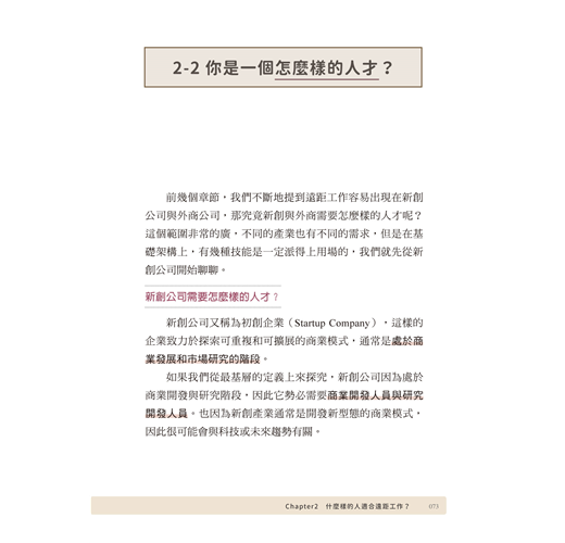 在這本書《啟動遠距工作,設計你的理想生活》,Zoey不藏私地分享了遠距工作的各種眉眉角角,到底什麼是遠距工作?怎樣可以投入遠距工作?什麼樣性格的人適合做遠距工作?遠距工作的優缺點等。