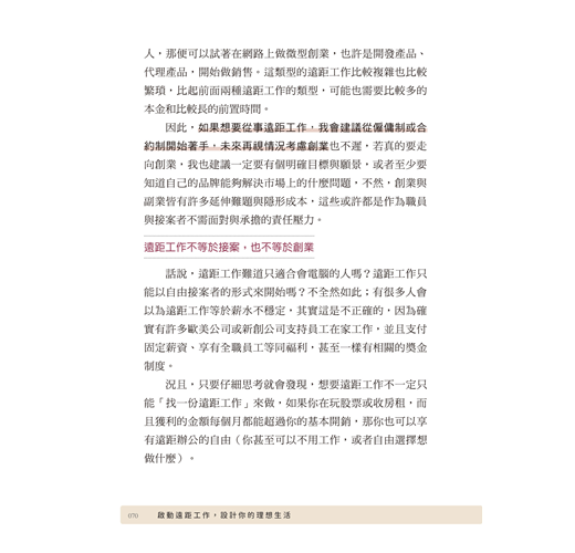 我希望這本書不僅讓你知道怎麼去「接軌」遠距工作之外,也可以讓你覺察到設計人生的重要性。當我們有越來越多的勞力工作被取代掉,你不用再做那麼多的繁瑣雜事,還能夠騰出更多的時間與空間時,你想要做什麼?你想要過上怎麼樣的生活?又或者,當你的價值不再透過工作來定義,你的理想生活樣態又會有怎樣的改變?