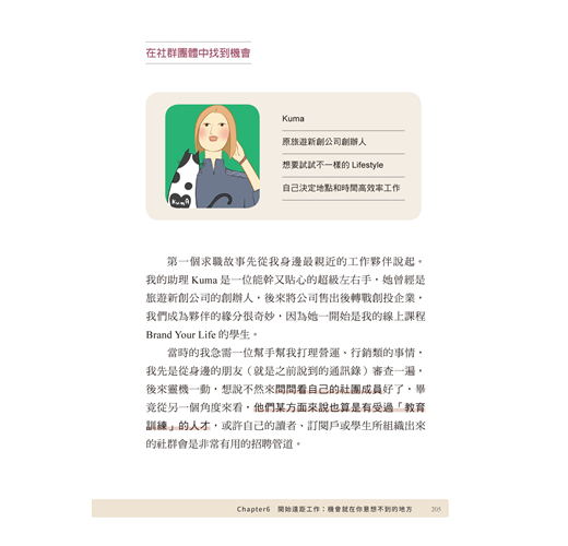 我也希望這本書除了以工具書的形式來幫助你之外,更希望能夠為你帶來一些靈感的啟發與未來趨勢的洞察,讓你能不只看到眼前的職涯,還能看見更長遠的人生規畫。願你我都能在不久後的將來邊工作邊生活,在喜歡的地方,用喜歡的方式,跟喜歡的人,做喜歡的事。