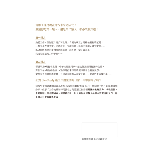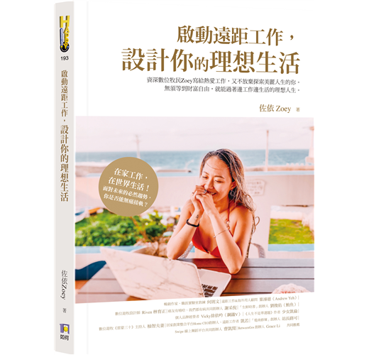 遠距工作,不只是一種工作選擇,而是能讓你藉由彈性規畫,找回人生掌控權的生活選擇,如果你也對遠距工作充滿好奇,想要一探究竟,Zoey這本書絕對能從各個面向協助你,幫你脫離框架,創造專屬於你的生活!