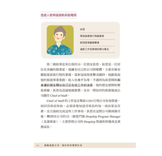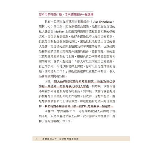 很多人會覺得遠距工作是知識分子和技術分子的特權,這在幾年前或許是一個事實,但在未來卻不見得是如此。我希望這本書能夠讓每一個人都了解──你有辦法為自己「創造遠距工作的機會」。而在未來,我們每一個人都得學著設計自己的工作,以及設計自己想要過的生活。