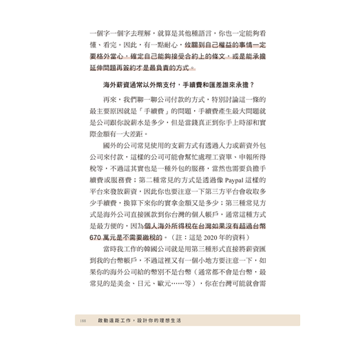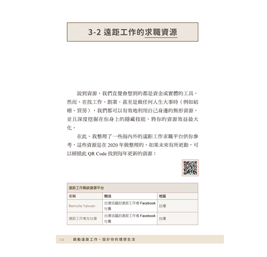 在這本書裡,我會介紹未來遠距工作可能會往什麼樣的方向發展、美國如何用遠距離辦公的模式來應對疫情、怎麼鍛鍊遠距工作必備的軟硬實力、遠距工作的求職資源、常見問題,以及怎麼利用個人品牌來實現遠距工作。