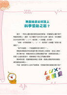 ●為什麼會這樣:屬於科學知識的延伸,以擷取故事的精華片段,做科學現象的分析。透過情境影片,讓「光精靈」勒克斯為孩子解說原理,科學生活化,學習意願高。