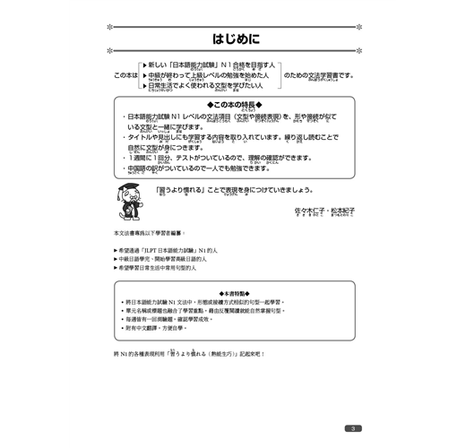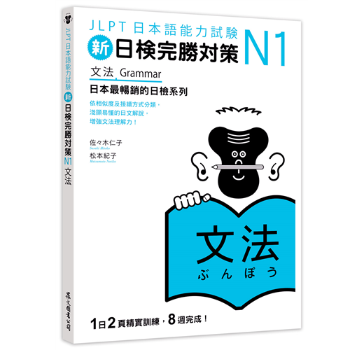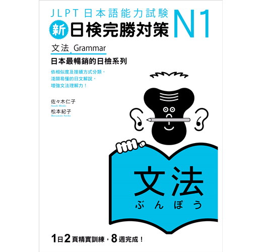 「新日檢完勝對策」系列由「JLPT日本語能力試驗」教材權威佐佐木仁子、松本紀子老師共同執筆,為考生規畫兩個月的應考讀書計畫。全套書籍從N5至N1分級共15冊,扎實奠定〈文法〉〈讀解〉〈聽解〉及〈漢字‧語彙〉四大基礎。