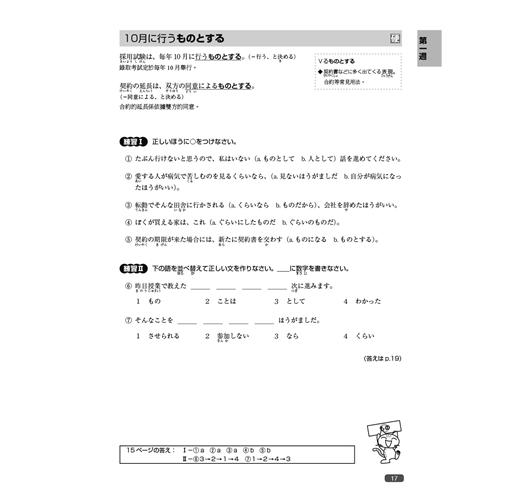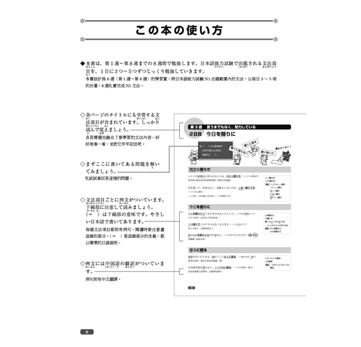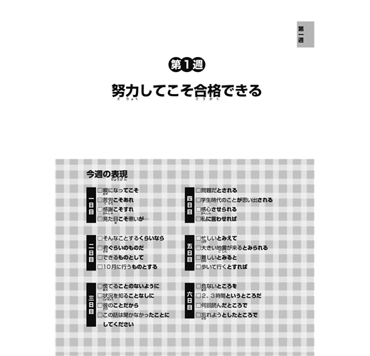 每日一主題,左右兩頁平均4個句型,份量適中。每週有「週學習表」,清楚標示每日學習目標,最後一日則是「實戰問題」。7天一循環,按部就班,兩個月有效達標。