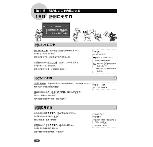 為幫助讀者在不同的場合正確表達,例句旁設有接續方式小叮嚀,並將重要提醒圖示化,如「會話常用」、「女性常用」、「用於負面」、「正式∕文書」……,一看就懂。此外,每週的「敬語小專欄」深入淺出介紹各式敬語,「接續詞小專欄」加強接續詞的分辨與練習。解說用字淺顯易懂,就算沒有老師帶領,也可以逐步完整學習。