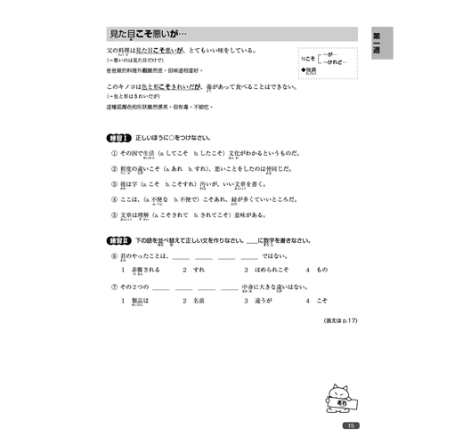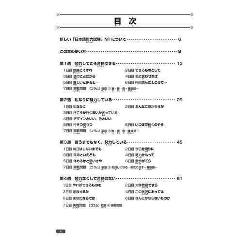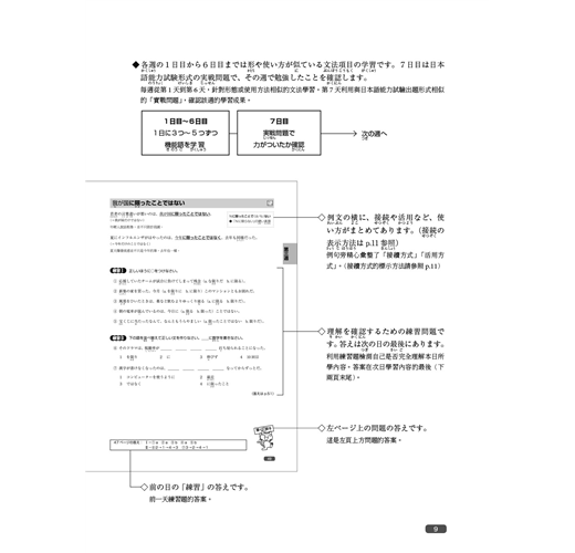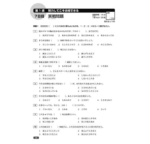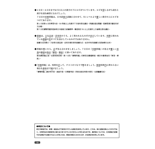 完成每日份量後,立刻上場刷題,確實掌握學習狀況;每週第7天有一回「實戰問題」,採日檢形式出題,25道題目,限時15分鐘,書末附有詳解。透過每日小練習,每週大複習,自我檢核學習成效,同時熟悉日檢題型,信心倍增。