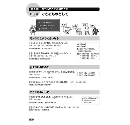 一般文法書條列文法時,通常以「~」省略其他字,如「~とも~とも」「~ところを」,而本書以搭配詞的方式呈現,如「いいとも悪いとも」「危ないところを」,不但提升對日語的敏銳度,搭配記憶事半功倍。