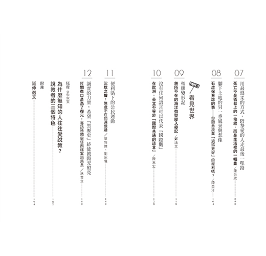 由長期關心社會運動與各項議題的獨立出版人──陳夏民,精心挑選12篇不同議題的選文,分別對應:個體、周遭、世界,由近而遠三個層次,讓讀者可以對在各種資訊滿天飛,新聞版面天天都是議題的時代,對世界上正在發生的各種狀況,有更深層的理解跟認識,並透過陳夏民在每篇文章所撰寫的:主編思辨,引導讀者有更多思辨的角度看待文章中的主張,每篇選文前皆有介紹引言,讓讀者對文章所討論的議題有基本的認識,在每篇文章最後,有思考練習,激發讀者看文章後磨練自己的思辨力。