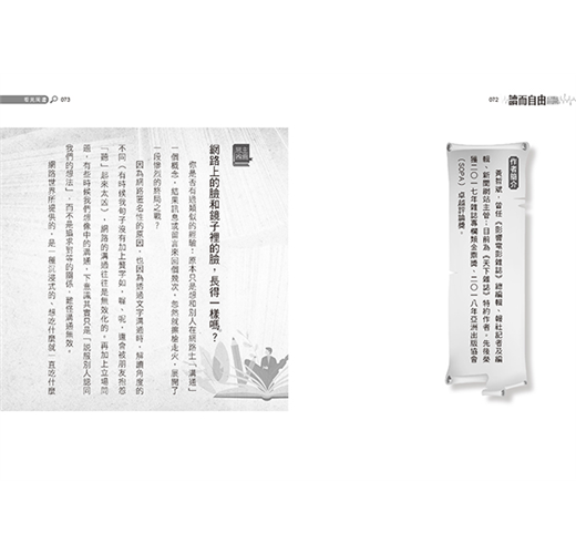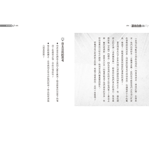 ˙本書探討社會上的各種議題,面向多元,包括:性別、性向、種族、環境保育、公民運動等,藉由閱讀選文引導,為抽象概念注入具體的解析,帶領讀者思辨社會的各種現象。