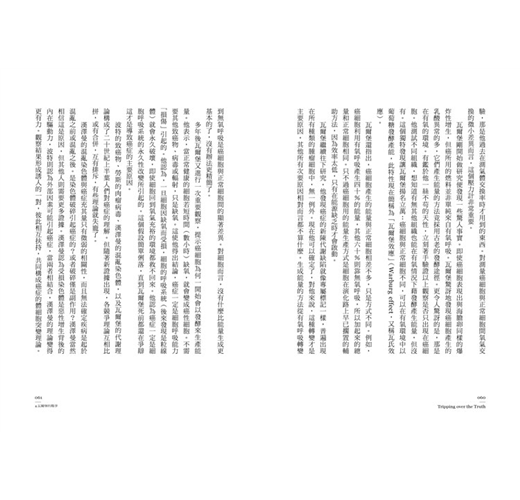 「我試圖在他人遺漏的地方尋找答案,那是一個受隱形教條、大規模集體思考和機構惰性保護的地方。也許阻礙進展的原因遠比我們想像的要深得多,但或許這才是最根本的,直指疾病科學基礎的核心。抗癌不力會是深植科學自身的問題嗎?提出論述是異端,大聲訴說則引來訕笑、駁斥甚至直接的憤怒,但我必須這麼說:也許我們誤解了癌症的起源;也許癌症根本不是基因病;也許我們輸了這場抗癌之戰正是因為科學家在錯誤的科學範疇中追尋——癌症不是基因缺損,而是某種代謝缺損的疾病?這本書是科學朝聖的高點,既有科學性又有人的故事,是瓦爾堡舊理論的復興,也有跟隨理論而來的治療結果。本書致力追求以各種角度發現的癌症本質,拿起所有拼圖塊,以新方式再把它們拼上。」──本書作者 崔維斯・克里斯托弗森