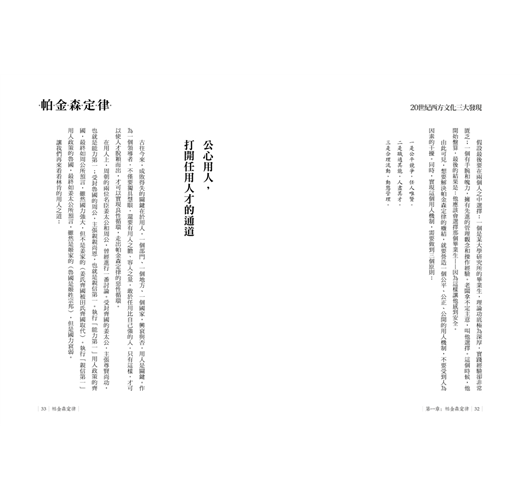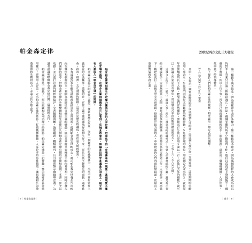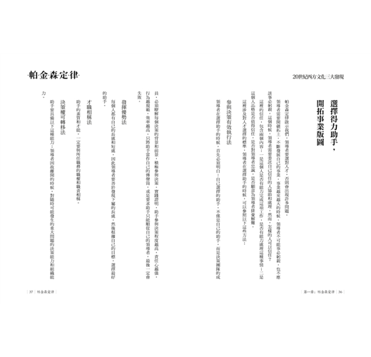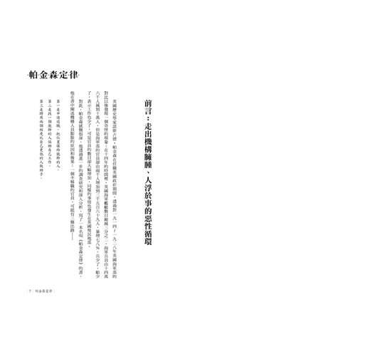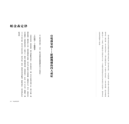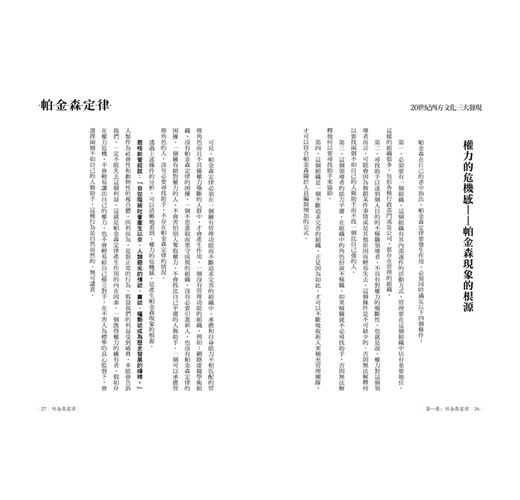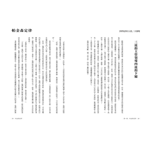 帕金森定律是一面鏡子,照出組織和公司治理中的陰影。帕金森定律是一記警鐘,警示領導者妥善使用權力,廣開用人管道,走出帕金森定律的陰影,打破機構臃腫、人浮於事的惡性循環,讓組織和公司煥發蓬勃的生機和活力,永遠立於不敗之地!