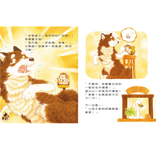 醫院的刻板印象就是打針、吃藥,看著故事中動物們有趣看病的過程,讓孩子閱讀時能夠哈哈大笑之後,輕鬆緩解對看病和打針吃藥的恐懼心理,孩子能夠從書中瞭解,其實看醫生並不是那麼可怕,醫生幫助生病的病人,給予不同的處方治療,也都是因為要讓身體趕快好起來喔!