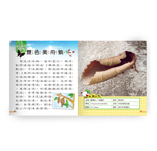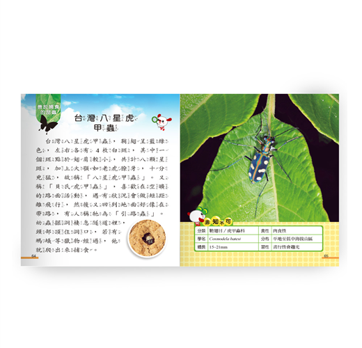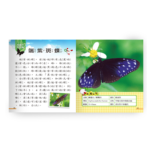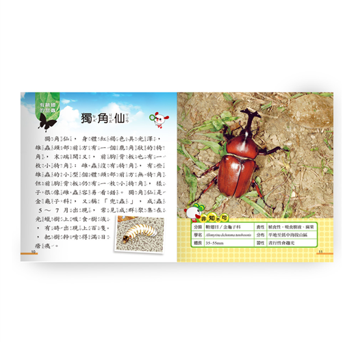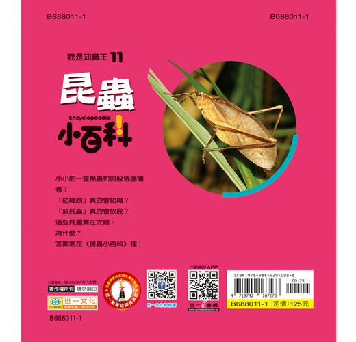 你知道嗎?只有六隻腳,身體分為頭、胸、腹三個部分的節肢動物,才能被稱為昆蟲,想要獲得更多有關昆蟲的知識,快快打開昆蟲小百科吧!本書共介紹51種昆蟲,內容廣泛而全面,讓小朋友對昆蟲的認識不再只限於蝴蝶、蜜蜂。每個昆蟲主題都會搭配2~4張圖,開本大小適合隨身攜帶,是可以陪伴小朋友一起郊遊 旅行的圖鑑工具書。共收錄51種昆蟲相關的知識,豐富又有趣