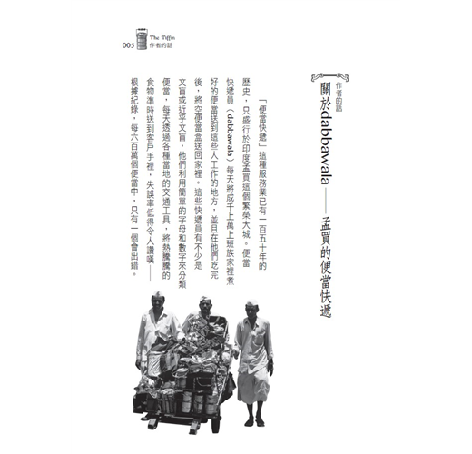 印度的孟買存在一種獨創的百年行業──便當快遞,dabbawala。每天由一群穿者白色庫塔衫的印度勞工,挨家挨戶收取早上剛做的便當,經由簡單的符號系統,在火車站重新分類,搭上火車,12點左右,準時配送到市中心的上班族手上。飯菜吃完的便當空盒,再經由同樣的配送流程,下午送回各個準備便當的家庭手上。