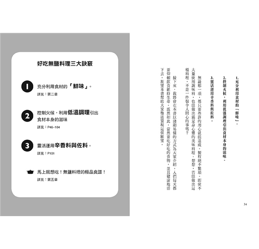憑藉長年累積的實務經驗與實力,大膽提出自己對無鹽料理的構想與做法。他的三大原則:善用食材鮮味、控制火候、運用香辛料,概念易懂、簡單易行、素人都容易上手!更佛心的是,這些烹飪原則廚藝學校也不教的,但作者卻詳細說給你聽!