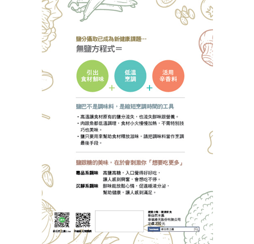 無私分享自創的無鹽料理,聰明運用三大原則,製造香濃醇厚、層次豐富的味道,健康不打折、料理依舊美味。
