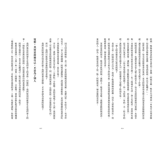 她帶領我們理解親子關係的焦慮,必須從不追求父母的認可、不期盼父母的愛做起,才能療癒原生家庭帶來的創傷。她也為我們解開親密關係的焦慮,無論結婚還是單身,唯有在情感上不依賴他人,擁有自給自足的快樂,才能獲得真正的幸福。