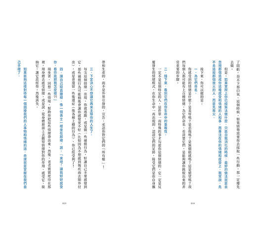 一定不是這個特定的人、這件單一而特殊的事才勾起你這個情緒的,它一定是反覆發生的情緒模式,在你生命中一再出現的。認清它們的足跡,接受它們是你自身攜帶和生產的,而不是外界引發的。宣告、承認你對它們的「所有權 」!