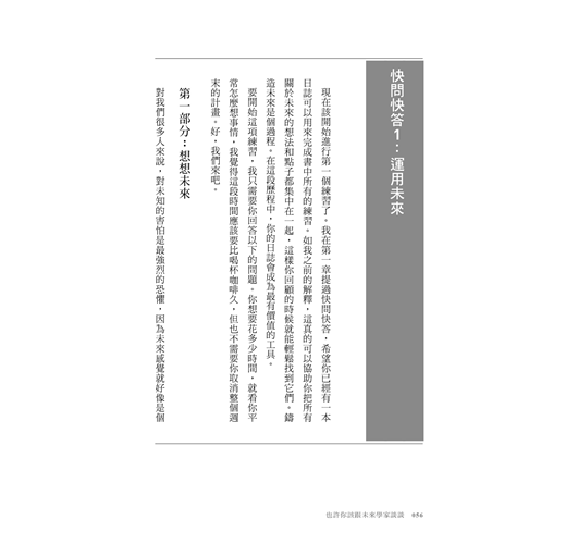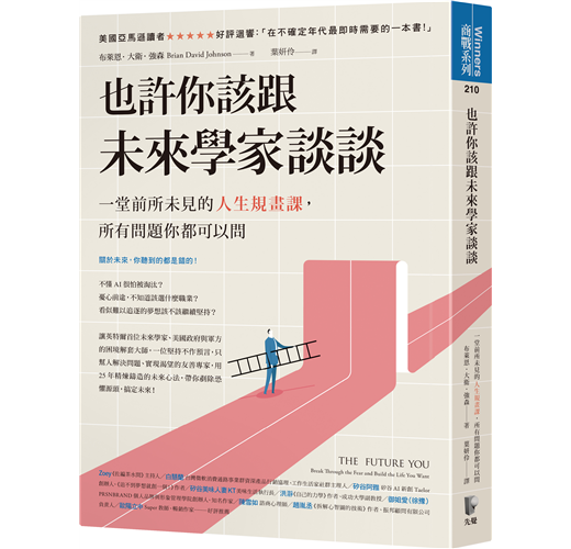 【推薦序】 我為個人公司聘請了一位未來學家 白慧蘭,台灣微軟消費通路事業群資深產品行銷協理、工作生活家社群主理人 未來會是什麼樣子? 有很多種可能,會變得更好,變得更壞,因為沒有標準答案,所以台灣廟宇香火鼎盛,藉著裊裊輕煙上達天聽,希冀神明能許善男信女一個光明的未來。 本書作者的職業是「未來學家」,協助企業用科學的方法看見未來十到十五年的發展,再採取積極的行動,掃除負面的變因,逐步實踐想像中最美好的未來。 每個人都是一間個人公司,除了是經營自我職涯與生涯的CEO外,我們還應該做自己的未來學家。擁有足夠的智慧,不受過去的經驗制約,相信自己的未來應該有無限的選項,然後有勇氣去探索與驗證。 傳說中的M社有一本死亡筆記本,四十歲以上超過十年資歷就等著被裁員,像我這樣的中年人,尾牙最愛做的事就是聚在一起數數看,還有多少張熟悉的面孔,倖存者再共飲一杯,感嘆著時不我予。 本書最讓我熱血澎湃的一句話是:「你的未來並沒有被寫死」。 太多人用自我狹隘的過去經驗傳遞負面能量:「中年人體力走下坡,不能承受挑戰」「中年人賀爾蒙混亂,喝水也會胖」「中年人記憶力減退,老狗學不會新把戲」,所以我們只能接受被淘汰的命運,這樣嗎? 大錯特錯。我才是未來劇本的創作家,未來是什麼樣貌,應該是由我親自來塑造。 首先我們得要有願景。十五年後我超過六十歲,是一個沒有三高,體力充沛的人,持續學習獲得新技能,得以擁有一份發揮所長的工作,並且斜槓成為膾炙人口的談判課講師。我有相親相愛的老公,工作之餘一起遊山玩水享受生活,孩子們都獨立自主,我們關愛彼此卻不互相依賴。 我現在做的每一件事都在實踐想像中的未來,為了健康,我毅然實行一六八間歇性斷食,四個月減重九公斤;每週固定投入四小時上網課,獲取新知識,保有職場競爭力;成立工作生活家社群,學習數位行銷技能,同時打破同溫層,與年輕人互動,融入新世代也成為新世代。但我不會讓工作占據所有時間,因為未來有很大的部分需要愛與關懷才會圓滿,老友與老伴更需要細心地培養,才會成為幸福人生的養分。 對未來很惶恐,不確定未來的自己會不會更好? 那就看這本書吧,讓未來學家教你怎麼做一個實作型的未來學家,其實老祖宗已經教我們了啊──也就是「要怎麼收穫,就怎麼栽」。 未來不遠,未來就在我們的手上。 【推薦序】 與這本書對話,落地你所期盼的未來 洪瀞,《自己的力學》作者、成大副教授 「未來學家」是什麼概念?在焦慮與期盼並存的時代,你或許曾這麼想過:我們光要活在當下,將手邊的人事物顧好、創造價值,就已經不是一個輕鬆簡單的工作了,那你又能如何去情境模擬未來,看懂未來,以及在當前做好務實的準備? 事物變化的速度愈來愈快,或許這也將是一種新的常態。若我們不懂得如何去預判未來即將產生什麼樣的變化,我們會很難在那樣的情況下與之產生良性的互動,也不會意識到,未來是可以被差遣的。只要你願意花點時間,仔細閱讀這本書,你將發現「未來」非但有跡可循,它還能在恰當的時刻,在地的助你一臂之力、為你所喚。 作者在書中很明確地指出,未來並沒有被寫死,而且會持續地被重複改寫。他提醒要小心那些預言家所說的話,遠離不被期盼的未來。此外,作者也非常用心輔助處於擔憂、焦慮,以及害怕陰影下的人們,教導如何能從中剖析出成長和突破的動能。 另外,作者在書中亦拋出一連串的問題,或許一時也不一定能獲得清晰的答案,然而只要經過思索,這一系列、開放式的提問確實能幫助讀者更深入覺察和提升自我的價值觀。當下的一切或許是由我們的過往所建構出來的,然而在鑄造未來這件事上,首先能做的就是推開過往。 本書之所以有趣在於,你會在閱讀後理解「未來」是充滿機會,並且獲得具體方法。作者運用了許多真實故事的情境帶領、淺顯易懂的逆向鑄造展示,一方面引導你學會模擬、鑄造並且落地你所期盼的新未來;另一方面則會發現這些落地未來的技巧離我們並不遙遠,而且輕鬆不費力。如果能認真地、系統性地思索作者的文字,你會彷彿幫自己多了一項鑄造未來的新技能,開啟更多通向嶄新未來的路。 我非常推薦你閱讀《也許你該跟未來學家談談》,這本由國際知名大廠的首席未來學家所撰寫的書;尤其在你學會如何取用未來助力,開始鑄造與落地屬於你的未來時,我也推薦你閱讀《自己的力學》,駕馭總總的力量,協助你勾勒出喜歡又獨特的未來篇章。 【推薦序】 未來,掌握在你我的手中! 趙胤丞,振邦顧問有限公司負責人、《拆解問題的技術》《拆解考試的技術》《拆解心智圖的技術》作者、知名企管講師 從事企業培訓這些年來,總會有學員私下找我討論,比如說,「我該不該轉職/辭職/轉調/外派?」「我該不該買房子/車子?」「我該不該生孩子/養寵物?」等諸多人生議題。身為培訓師,對於學員們的提問,我總相信「解決方案在學員自己身上」,只是目前他們還沒覺察到而已,我要做的是讓他們回到自己身上再次確認哪些是自己所需、哪些不是。畢竟,每個人的人生是獨一無二的,其他人的建議都僅供參考。聽完他人建議突然熱血沸騰,只是「晚上想想千條路,早上醒來走原路」的人卻也沒少見過。 當我自己遇到問題瓶頸時,就會開始找尋方法,而閱讀就是一帖良藥。透過詢問專家