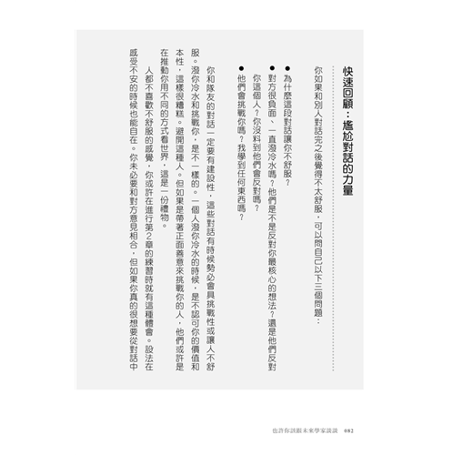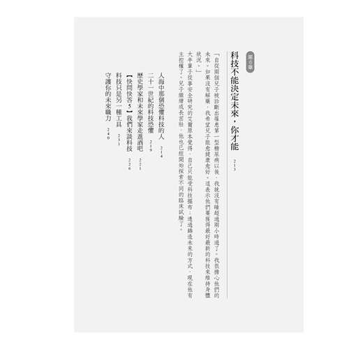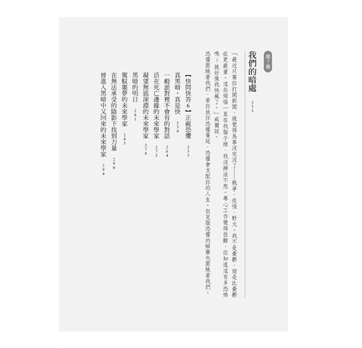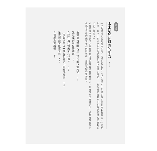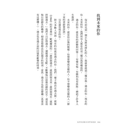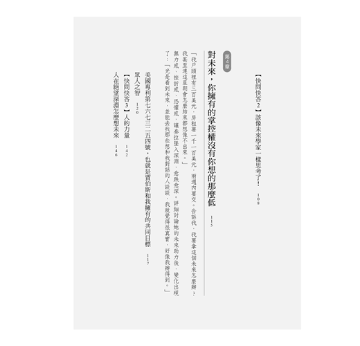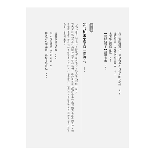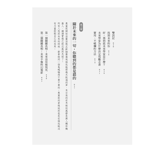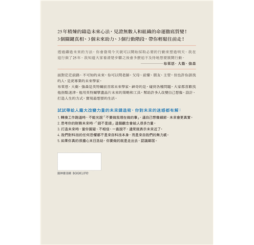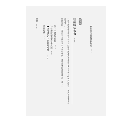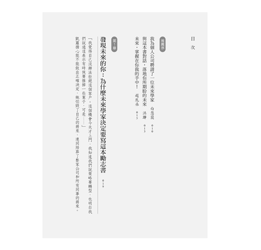 〈推薦序〉 我為個人公司聘請了一位未來學家 白慧蘭 與這本書對話,落地你所期盼的未來 洪瀞 未來,掌握在你我的手中! 趙胤丞 第1章 發現未來的你:為什麼未來學家決定要寫這本勵志書 「我覺得自己沒辦法拒絕這個客戶。這個機會今天才上門,我知道我們說策略要轉型,也明白我們說過這表示有時候要推掉一些案子,可是……」 凱蘿擔心能不能做出正確決定,她怕毀了自己的將來,連同陪葬了整家公司和所有同事的將來。 雙訊記 找到未來的你 好,那到底未來學家是什麼? 未來學家為什麼決定寫勵志書? 實用、不唬爛的方法 第2章 關於未來的一切,你聽到的都是錯的 奧黛莉開始活靈活現且鉅細靡遺地描述她那幾天做過的夢,末日後的世界裡到處都是無人機和機器人,擴增實境已經氾濫到失控了。 所有人想到未來的時候,都會被同一個鬼魂嚇得不要不要的。奧黛莉的夢境說到底是在描述她沒有力量控制自己的未來。 第一個關鍵真相:未來沒有被寫死 第二個關鍵真相:未來不像科幻電影 第三個關鍵真相:未來有個不可告人的小祕密 提防預言,以及創造預言的人 未來學家聽你差遣 ●快問快答1:運用未來 第3章 如何和未來學家一樣思考 「我知道自己不想一直做現在這份工作。你覺得我該做什麼?」 在大型科技公司擔任高階行銷主管的蘇珊,想知道怎麼在職涯中場轉換到她真心想要的工作,而不是順著別人的指示一直做下去。這時,我很喜歡問一個問題,會讓對方真正開始質問自己到底想要什麼樣的未來。 鑄造未來的步驟 深入檢視鑄造未來的方法 鑄造未來的祕訣:過程才是重點 ●快問快答2:該像未來學家一樣思考了! 第4章 對未來,你擁有的掌控權沒有你想的那麼低 「我戶頭裡有三百美元,房租要一千一百美元,兩週內要交。告訴我,我要拿這個未來怎麼辦?我甚至連這星期會怎麼結束都想像不出來。」 無力感、挫折感、恐懼感,讓泰拉繼續墜入深淵,愈跌愈深。詳細討論她的未來助力後,變化出現了:「光是看到未來,並且能夠去找那些想和我對話的人談談,我就覺得很真實,好像我辦得到。」 美國專利第七六七三二五四號,也就是賈伯斯和我擁有的共同目標 眾人之智 ●快問快答3:人的力量 人在絕望深淵怎麼想未來 第5章 未來始於你身處的地方 「我是個明尼蘇達州的屁孩,這裡鳥不生蛋,我又沒錢,只有個名不見經傳的美術學位。」戴著鼻環、頸子上有孟加拉虎的大刺青的小羅搖著頭說:「我怎麼可能到全世界最重要的皮克斯動畫公司工作呢?」 小羅的故事強調了人居住的地方會影響你是什麼樣的人、你會變成怎麼樣的人。我總會鼓勵客戶在思考自己的未來會如何發展時,想想地點的重要性。 前方有完整的人生,可是看不到未來 就近找到未來的關鍵 在居住地找到未來(伴侶) ●快問快答4:讓我們裹足不前的那些事 拯救過去來展望未來 在當地創造改變 第6章 科技不能決定未來,你才能 「自從兩個兒子被診斷出罹患第一型糖尿病以後,我就沒有睡超過兩小時過了。我很擔心他們的未來。如果沒有解藥,我希望兒子能愈健康愈好。這表示他們要獲得最好最新的科技來維持身體狀況。」 大半輩子從事安全研究的艾爾原本覺得,自己只能受科技擺布,在透過鑄造未來的方式後,現在他有主控權了。兒子繼續成長茁壯,他也已經開始探索不同的臨床試驗了。 人海中那個恐懼科技的人 二十一世紀的科技恐懼 歷史學家和未來學家走進酒吧 ●快問快答5:我們來談科技 科技只是另一種工具 守護你的未來職力 第7章 我們的暗處 「最近只要你打開新聞,就覺得鳥事沒完沒了──戰爭、疫情、野火。我不是憂鬱,而是比憂鬱症更嚴重。這些煩惱一直在我腦子裡,我沒辦法不想。專心工作變得很難,你知道這有多恐怖嗎?就好像我快瘋了。」威爾說。 恐懼圍繞著我們,如果你放任恐懼蔓延,恐懼會支配你的人生。可是克服恐懼的解藥也圍繞著我們。 ●快問快答6:正視恐懼 真黑暗,真是快 一般派對裡不會有的對話 活在死亡邊緣的未來學家 凝望無底深淵的未來學家 黑暗的明日 駕馭噩夢的未來學家 在無法承受的陰影下找到力量 曾進入黑暗中又回來的未來學家 在世界的盡頭發送餅乾 第8章 往前鑄造未來 「妳已經經歷過整套流程了,妳覺得鑄造未來這套方法怎麼樣?」我問蘇珊:「妳的未來遠景有沒有變?」 她開始說:「我向別人提到這套方法的時候,通常都會說這就像烹飪一樣。」 兜了一圈回到原點 為什麼鑄造未來就像烹飪 ●快問快答7:我們開始吧! 準備起飛 致謝