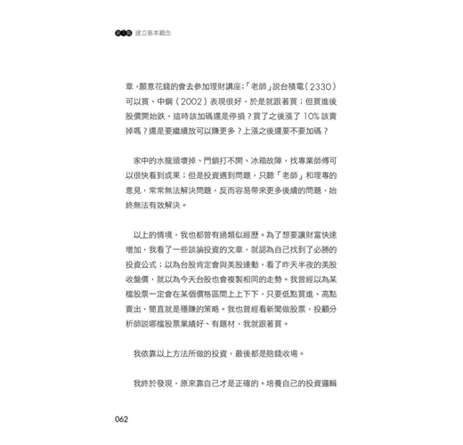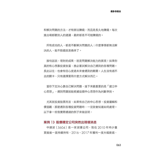 反觀我的「傻多存股法」,在我2011年以前股票資產30萬至40萬元的時候,我就採取分散投資。當我股票資產放大10倍,成長到300萬至400萬元的時候,我也可以用同樣的方式操作。當我持續用工作收入買進股票,在股票資產放大到3,000萬至4,000萬元的時候,跟剛開始相比資金已經放大100倍,我依舊使用同樣的邏輯在操作;而且隨著操作時間愈來愈長,操作邏輯變得更清晰,也愈來愈熟練,愈來愈能體悟到投資的真正道理。