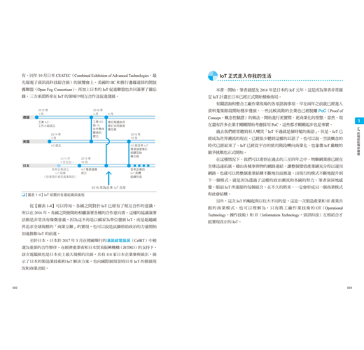 第三,除物聯網概念介紹與如何進行之以上兩點外,本書特別結合許多日本實際案例與現況應用加以說明。由於日本的製造業具相當的水準,對許多台灣的公司來說,的確有值得借鏡之處。因此,藉由介紹日本物聯網發展經驗與相關日本公司的應用與作法,應可提供台灣讀者一些寶貴的經驗。