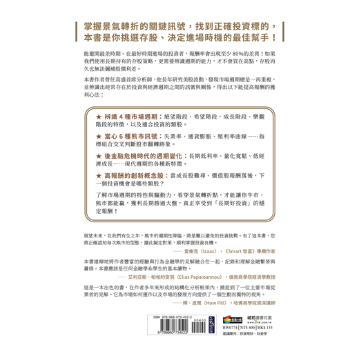 除了牛熊市外,本書也花費了相當篇幅闡釋在不同經濟週期下,您可以預期的股債資產的長期投資報酬。不只如此,針對各類股和產業類型常有的報酬表現,例如週期型、防禦型、價值型和成長型股票,如何根據其本質不同,搭配經濟週期循環來正確評斷其隱含的投資價值?閱讀此書,您都將了然於胸。
