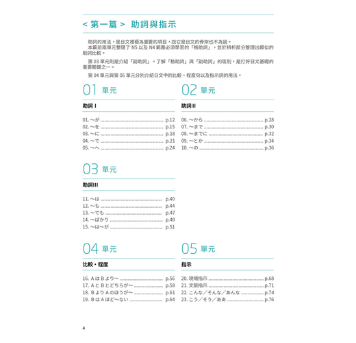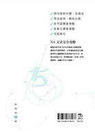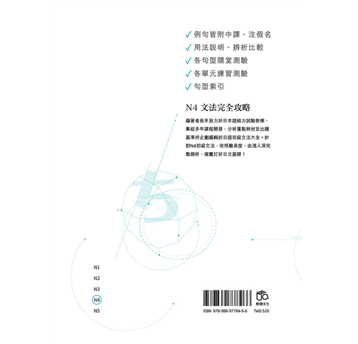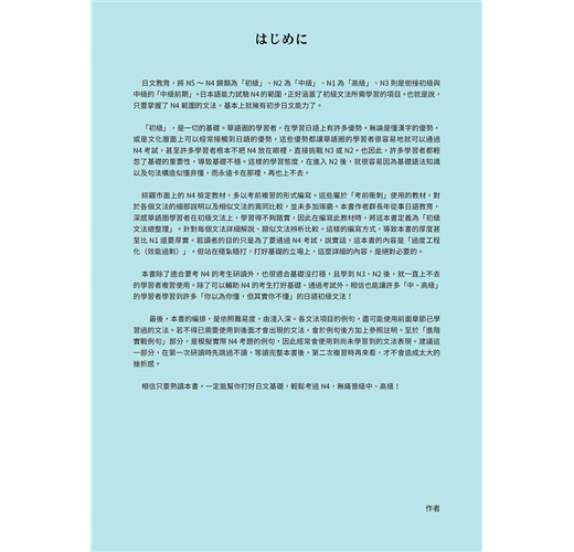 綜觀市面上的N4檢定教材,多以考前複習的形式編寫。這些屬於「考前衝刺」使用的教材,對於各個文法的細部說明以及相似文法的異同比較,並未多加琢磨。本書作者群長年從事日語教育,深感華語圈學習者在初級文法上,學習得不夠踏實,因此在編寫此教材時,將這本書定義為「初級文法總整理」。針對每個文法詳細解說、類似文法辨析比較。這樣的編寫方式,導致本書的厚度甚至比N1還要厚實。若讀者的目的只是為了要通過N4考試,說實話,這本書的內容是「過度工程化(效能過剩)」。但站在穩紮穩打,打好基礎的立場上,這麼詳細的內容,是絕對必要的。