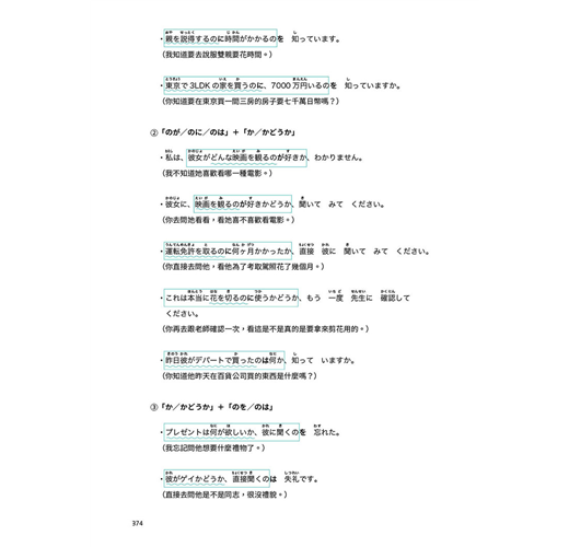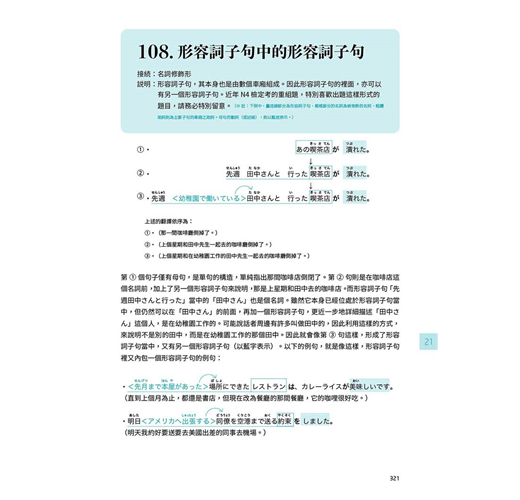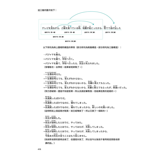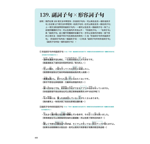 ⑤本書亦詳細介紹日文句法中的各種複句(形容詞子句、名詞子句、副詞子句),以及這些複句之間互相應用的表現。了解子句之間的關係,是打好日文閱讀基礎的第一步。