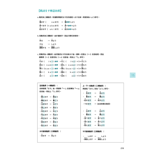 ③詳細剖析動詞變化(活用)與動詞後接的各種句型表現。目前在台灣的日語教學,老師教導動詞變化時,有兩種方式:分別是「從動詞原形改成其他各種型態」和「從動詞ます形改成其他各種型態」。本書兩種方式並列,請讀者挑選自己習慣的方式閱讀即可。