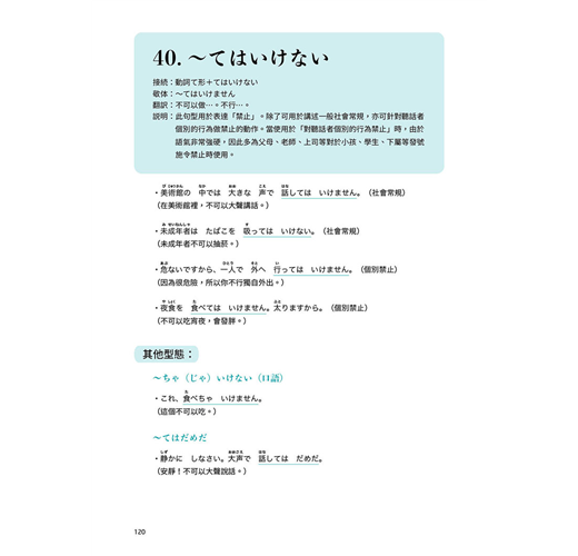 ①每項文法除了詳細說明外,各個例句亦附上假名讀音以及中文翻譯。