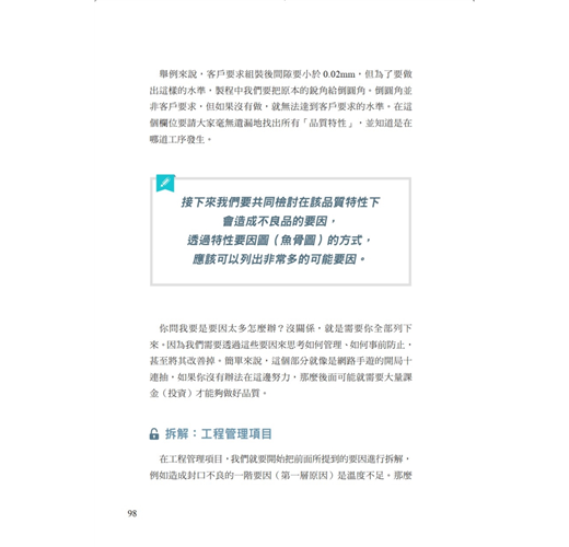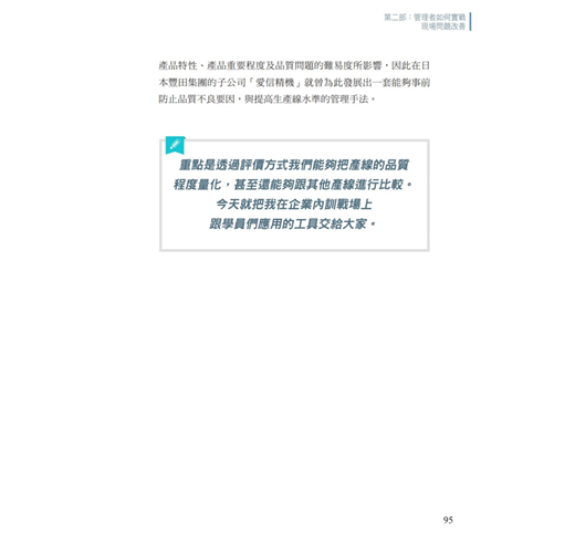 幫助現場管理者問對問題,找出有效提升生產效率的方式。司徒達賢(政治大學 名譽講座教授):「在拜讀江先生這本大作後,感到受益良多。而他從實際問題出發,並結合前人經驗,提供具體解決辦法以說明觀念的方式,也是值得我們學習的。」