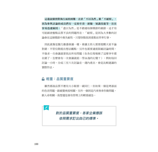 于卓民(政治大學企管系 特聘教授):「本書分享他多年實務累積的經驗,也展現他回應讀者需求的快速行動力,絕對是對有志於提升工作現場生產力的管理人員和執行人員一讀的好書。」