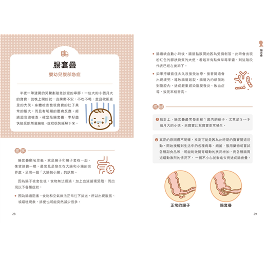 臍帶照護:臍帶什麼時候才會掉呢?/黃疸:寶寶一天比一天黃怎麼辦?/囟門:頭頂軟軟的可以摸嗎?/新生兒感染:你真的該擔心的發燒之一!/珠瘤、鵝口瘡、新生牙:嘴裡白白的那是什麼?/喉頭軟化症:小豬呼嚕嚕的聲音?/腸套疊:嬰幼兒腹部急症/便祕:肚子怎麼好痛啊?/牙齒還不長:這是缺鈣嗎?/尿道感染:尿尿有怪味?/脂漏性皮膚炎:寶寶怎麼滿臉小痘痘?/慢性蕁麻疹:怎麼又紅又癢?/皮膚黴菌感染:夏天皮癢症/掉髮:我的寶寶怎麼禿頭了?/維生素D:喝純母奶的寶寳很需要!/水解蛋...