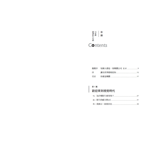 推薦序 每個人都是一家媒體公司 藍諾 序 讓全世界都相信你 引言 你就是媒體 第 1 篇 歡迎來到視覺時代 1 為什麼影片會奏效? 2 影片的威力與4E 3 我展示,故我存在 第 2 篇 打造業務影片的技巧 4 會對銷售和成交率立刻產生衝擊的6支影片 5 80%影片 6 放在電子郵件簽名檔的小傳影片 7 適合度影片 8 成本與定價影片 9 顧客旅程影片 10 「我們聲明」影片 第 3 篇 購買行為和行銷的變化 11 最常見的行銷挑戰 12 新的消費者行為帶來行銷新世界 13 如何將影片融入在消費者旅程之中 14 案例:Miovis...