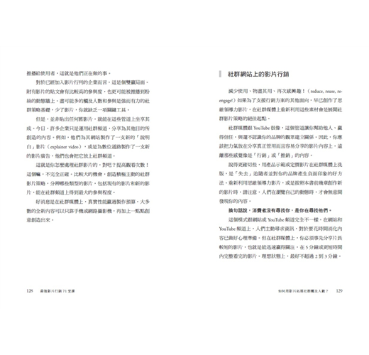名人推薦:▌專業推薦 陳延昶/486團購創辦人 藍 諾/專一影音有限公司導演 六指淵/無限設計學院創辦人 《最強影片行銷71堂課》是任何一家想在新世代裡成功的公司必須閱讀的書。不管喜不喜歡或是接不接受,學會用影片溝通想法、創造流量、拓展業務、是最有效且最能讓人印象深刻的方式。 ──藍諾(專一影音有限公司導演)