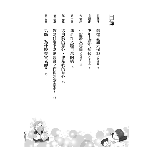 以志願為主題,寫出這本小說,其實有點自肥的態度,直接以我自己最了解的獸醫為背景,雖然有點不好意思,不過若以別的職業為主,反而覺得無法把立定志願這件事寫得透徹。