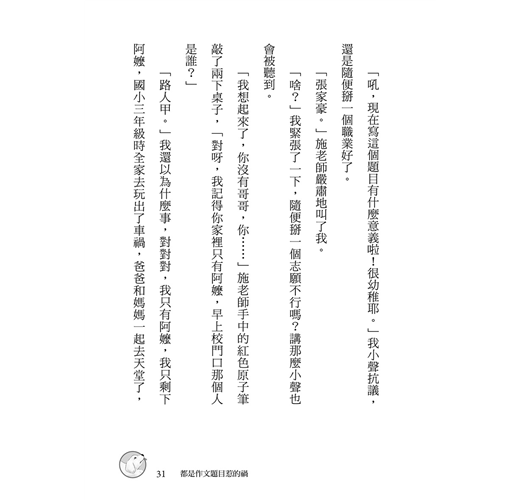 「路人甲。」我還以為什麼事,對對對,我只有阿嬤,我只剩下阿嬤,國小三年級時全家去玩出了車禍,爸爸和媽媽一起去天堂了,我莫名其妙地留下來,繼續上學,繼續過日子。我好生氣,根本就不想寫這什麼志願,這種東西不應該是跟爸爸媽媽說,然後會被媽媽摸頭稱讚,或者起爭執後,被爸爸怒吼著說什麼不行的話。
