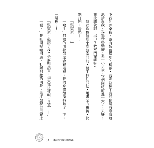 我拿起書包,空白的稿紙就擱在一旁,帶去學校也沒用,算了,等老師催再繳交,更何況少交一篇作文也不會怎樣。