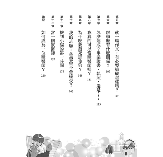 我想當獸醫師嗎?我不斷地問我自己,矇矓中,我看見自己穿起綠色的刷手服,套著潔白無瑕的醫師袍,脖子上掛著聽診器,幫大白狗拆下外固定包紮,牠舔了我的臉頰,然後開心地在診間又跑又跳,黑白貓阿九在我褲管旁來回走動,還有矮小的臘腸狗吒吒也在,牠那風火輪不停地咻咻穿梭在大白狗腳下。我坐在地上摸阿九,越來越多的狗跟貓靠過來,唉呀,好擁擠喔!──摘自第六章跟學歷有什麼關係?