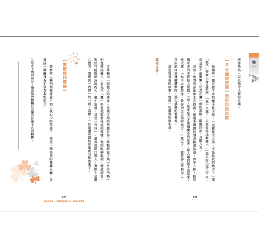 【故事課】提綱挈領的帶你認識說故事的原則。【讀經典故事】精選經典文學中的精采段落,原汁原味的呈現故事的樣貌,另有詳盡的【注釋】輔助閱讀。在【引導式閱讀理解】單元,由詩佳老師講授故事的精采之處,同時解析大師們的寫作方法,達到「閱讀素養與寫作引導,雙軌並進」的學習目標。【3分鐘說故事】由詩佳老師親自示範如何向大師們學習寫作。最後是【實戰寫作演練】,讓你隨著引導,也能創作出自己的故事。