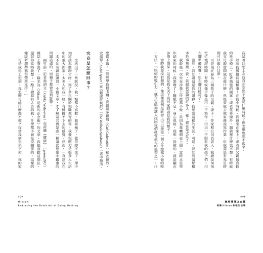 可是我想起另一件事:我們根本不知道該怎麼實踐它。儘管什麼都不做,或者無所事事聽起來很簡單,實際上它一點都不簡單。事實上,如果每次有人問我該如何進行Niksen,我就能得到一分錢的話,我現在大概已經是百萬富豪了。我了解到,多數人都需要有人來教導如何擺脫忙碌的生活。我寫這本書,正是希望能幫助人們理解什麼都不做該如何進行,讓世人了解,坐在沙發上Niksen一下是很正當的事。