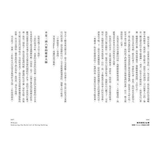 旅居荷蘭的奧爾嘉擁有幸福的家庭、美麗的房子,她的生活井然有序、從容不迫,但沒有人知道,她也曾經缺乏自信,覺得自己是個失敗者,生活忙亂到喘不過氣來,而改變她人生的契機,正是荷蘭人引以為傲的生活哲學「Niksen」!