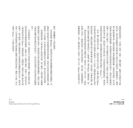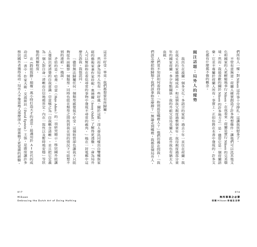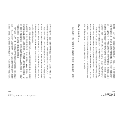 身為作家、記者,我一直緊密觀察著這個國家和它的居民,而我可以告訴你,Niksen是不折不扣的荷蘭文字,而文字的出現通常都伴隨著某種觀念或哲思。在荷蘭,它的涵意是無可爭議的。另一方面我也發現,荷蘭人和我們所有人一樣,對Niksen這件事十分掙扎。這讓我欣慰多了。