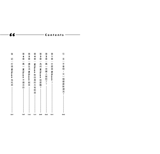 我並非沒有想到,在一本健康潮流書中批判健康潮流書,是多麼諷刺的一件事,但實際上這是本書的一個重點。我相信Niksen不同於一般健康潮流,我也確信當你看完本書,你將會同意這說法。別的不說,不同於其他健康潮流,Niksen並不要求你改變或改進自己。是不是讓人耳目一新?
