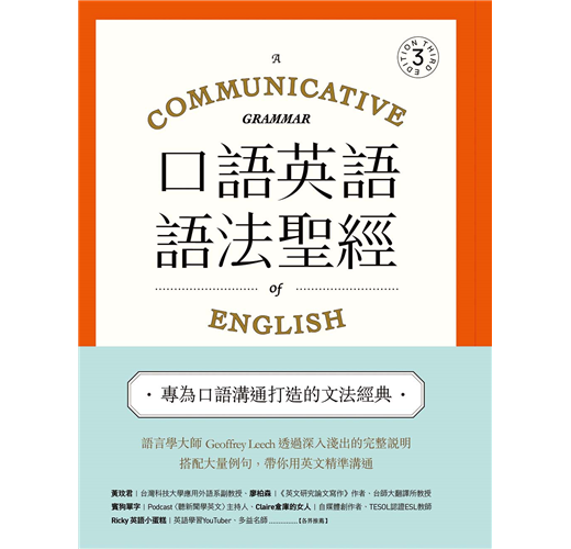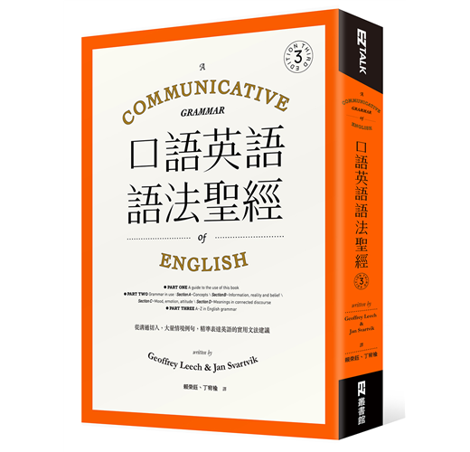 如今,EZ叢書館引進這本長青之作《口語英語語法聖經》第三版,將有助讀者了解英語口語背後的語法規則,能大幅提升口說英語的能力。兩位作者Geoffrey Leech和Jan Svartvik都是國際知名的語言學家,專長為英語語法和語料庫等領域,相關著作論文等身。本書第一版於1975年上市就廣受學界肯定,筆者於1992年在美國紐約大學攻讀英語教學碩士學位時,教授就指定這本書為必讀的工具書,如今多年後終於可在台灣看到精編的第三版中文書,真是備感親切,也為國內的學子感到慶幸。