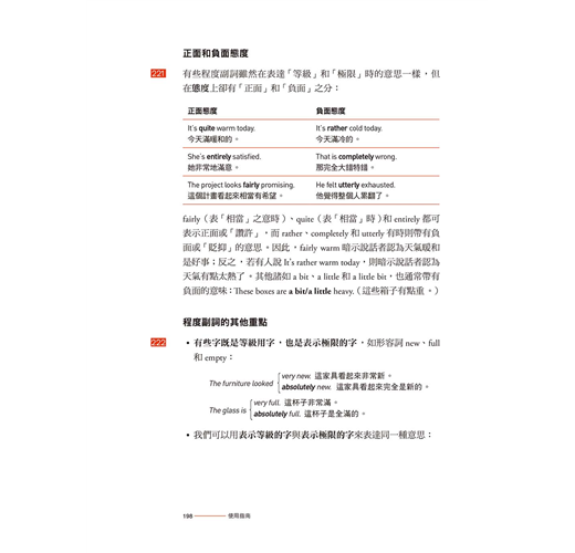 語言學家Geoffrey Leech鑽研英語文法逾40年,本書歷經三次修訂,內容與時俱進,即使放在今日依然實用。書中說明英語語法的細微差別如何影響溝通,並搭配選自朗文語料庫 (Longman corpus) 的真實情境例句,幫你精準使用英文。It’s quite warm. 和 It’s rather warm. 兩句意思相同,但所使用的副詞不同,要傳達的弦外之音便完全不同:前者是正向的,後者偏向負面不耐煩。