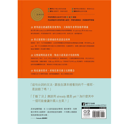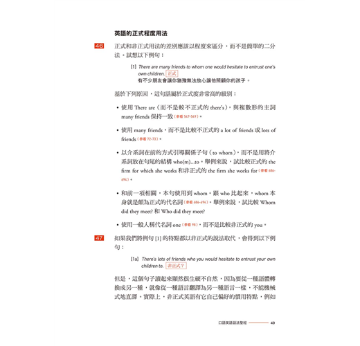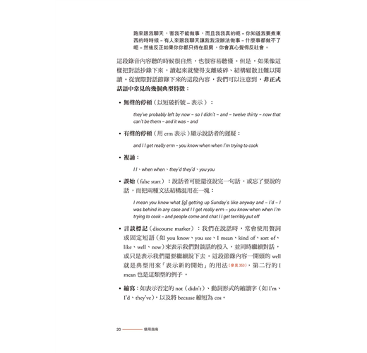 這本書以主流的溝通式語言教學法 (Communicative Language Teaching) 為理論基礎,不但破除一般人以為溝通式教學法不重視文法的刻板印象,更強調口語形式與溝通功能的結合,也就是:如何在特定情境使用恰當語言形式和結構,達成有效的溝通。此外,口語語法不僅是字詞句型構成的規則,更包括發音、重音(stress)、語調 (intonation)、聲調 (tone)、語塊 (chunking)、停頓以及與人對話的合作關係等多種層次,這些都在口語溝通過程中扮演傳達語意、情緒和態度的角色。更貼心的是,書中講述時還標示了口語、書面、美式、英式、正式、非正式、禮貌、親近口語等標籤,讓讀者了解英語在不同語體、地理區域和情境中的得體使用方式。另外,本書還有一個特色,就是使用語料庫 (corpus) 來提供真實的例句。我自己在編寫英文寫作和翻譯教科書時,也常依據語料庫中大量而有代表性的英文文本來分析語言現象和提供例句,而不是為了說明規則自行編造句子,如此讀者閱讀時才不覺生硬呆版或脫離現實。